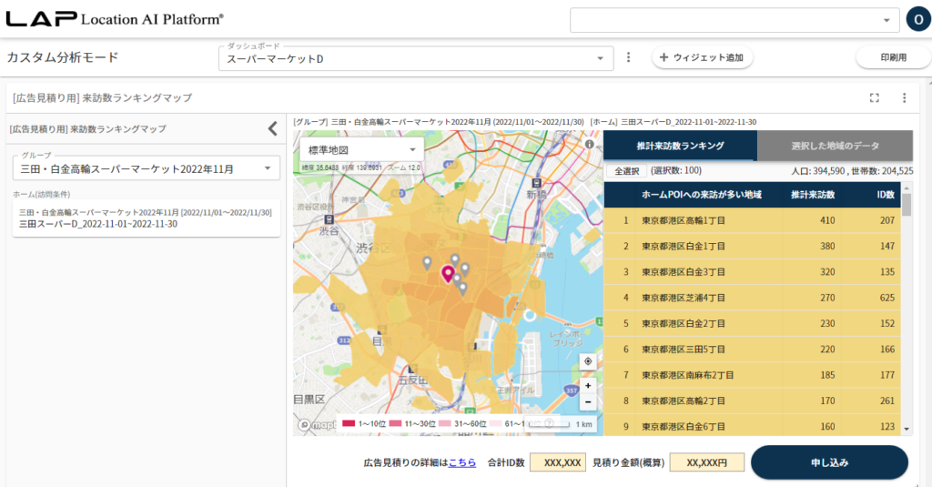 たとえば、ある店舗に来訪する人が多く居住しているエリアや、競合店舗と併用している傾向が見られるエリアなどを統計的に抽出することで、広告展開の優先地域を可視化できます。