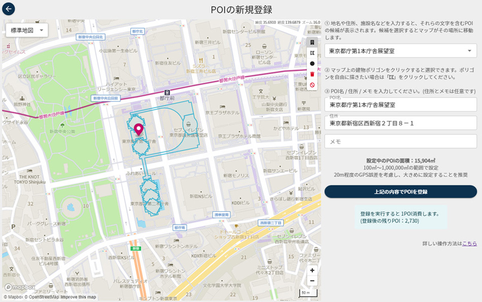 自分で登録するPOI(*注2)は任意の場所をポリゴン(施設・エリアの形状)で描いて指定することが可能です。地図上の建物をAIが自動的に判定して1クリックでポリゴンの形状で選択できます。