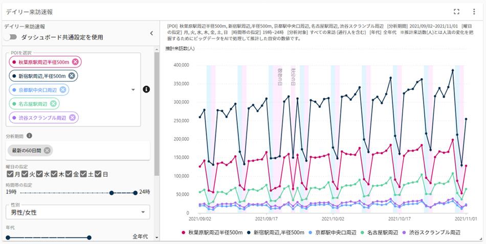 本製品には利用開始日から遡って13ヶ月分の位置情報ビッグデータが実装されていますので、直ぐに昨年対比を視覚化できます。また、利用開始日の翌日からは前日のデータを翌日の午前中に更新。ほぼリアルタイムで任意の地点の人流の変化を確認できます。