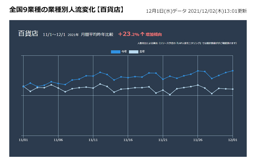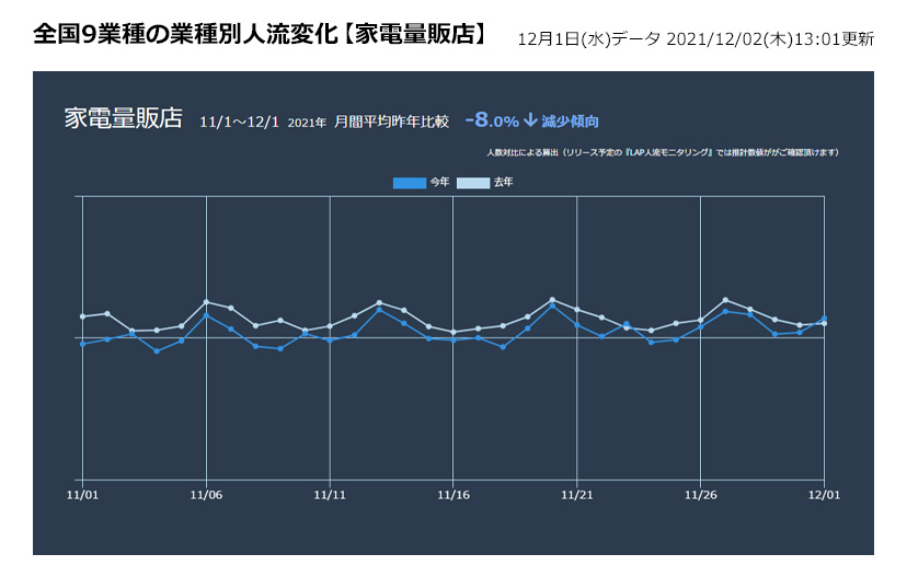 12月1日デイリー速報として、全国主要9業種中5業種で【人流減少】の変化が確認できました。
