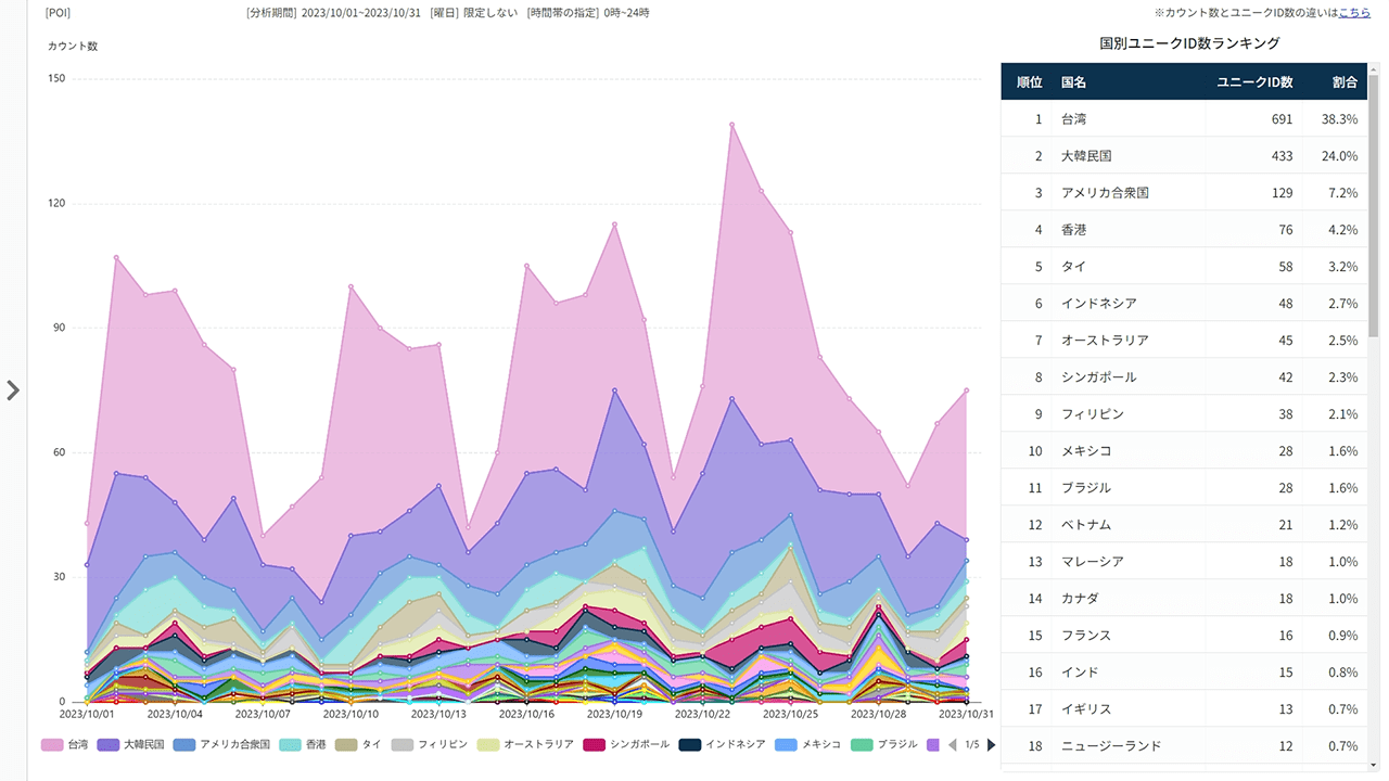 月間100万ID以上の訪日外国人の位置情報データを使用しています。さらに世界42億のスマホ端末IDを活用した高度な居住国判定により、精度の高い分析が可能です。