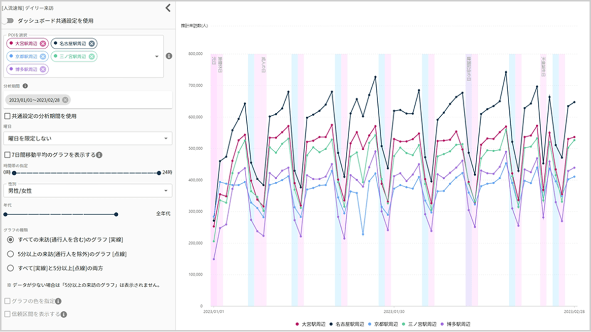 曜日(平日/休日)、時間帯ごとの人流データを分析