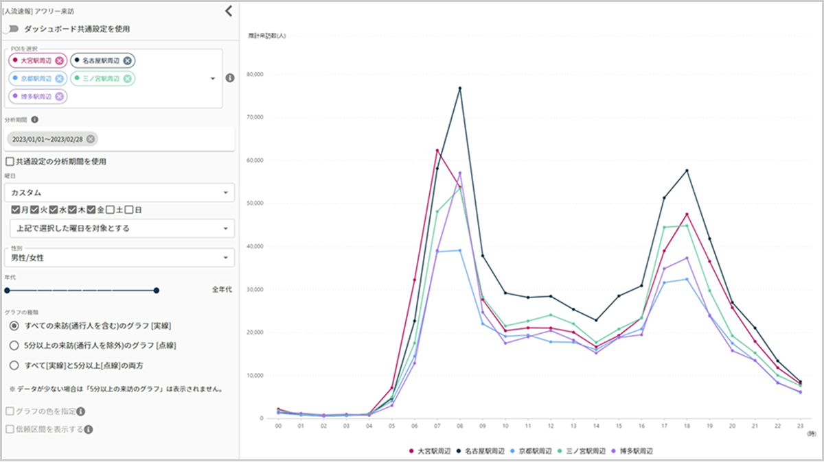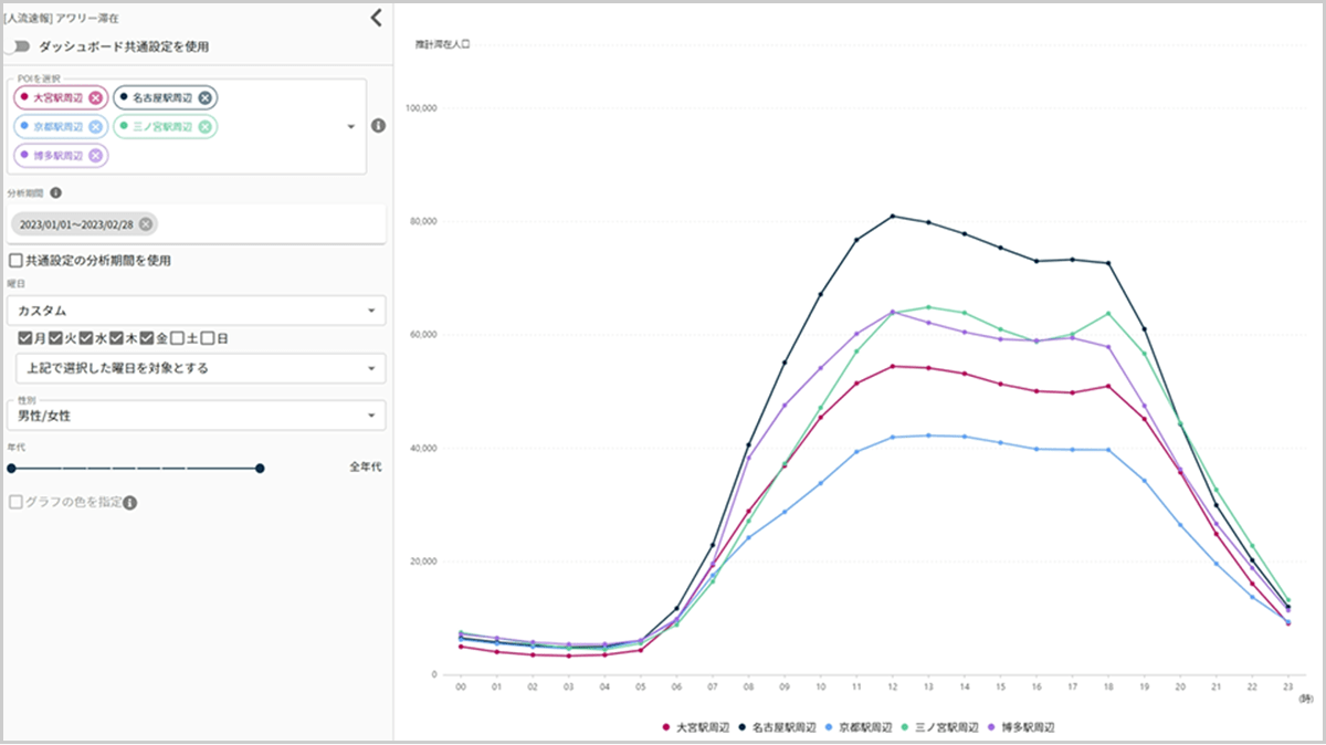 店舗周辺や商業施設、観光地など、気になるエリアの人流を「見える化」して、ビジネスやマーケティングのアイデアにぜひお役立てください。