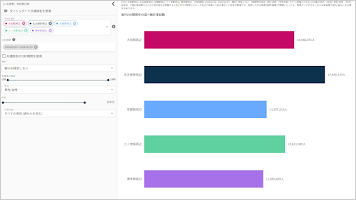 POIと期間などの条件を設定することで、各POIの期間中の延べ推計来訪数の合計をグラフで比較できます。