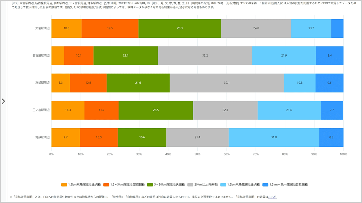 どれぐらい離れた場所から来訪している人が多いのか、その割合をグラフで確認することができます。